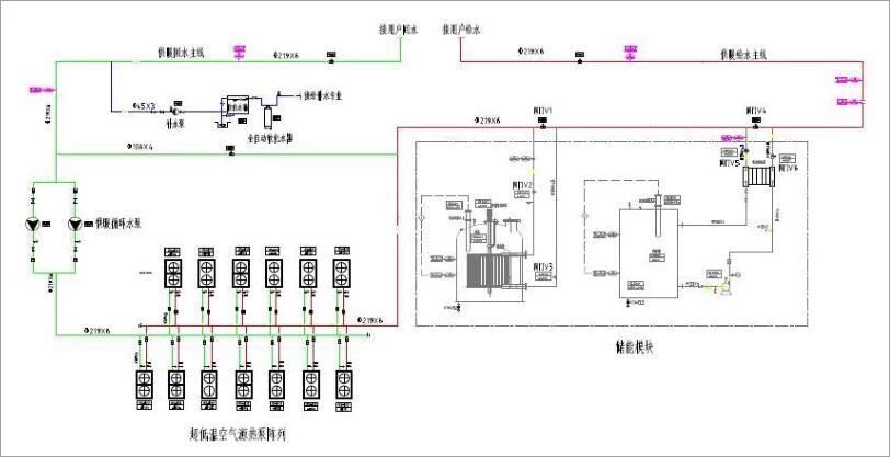 原来的工程项目采用空气源热泵对小区燃煤锅炉进行“煤改电”清洁供暖改造。小区供暖面积7.2万平方米,采用25台额定制热量140KW空气源热泵低温机组进行供暖。系统主要设备配置及工艺流程简图如下。