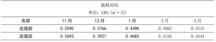 根据供暖系统改造前后2年的运维数据统计,增加储能模块之后,供暖季谷电利用占比由原来的32.6%提升到了44.0%,单位面积能耗增加了4.5%,单位面积电费降低了14.2%。具体数据详见表4-表6。