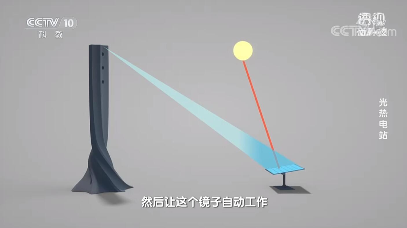 咱们超级镜子进入电站的前半部分,其实你可以把它想象成一个太阳灶,我们原来用的太阳灶就比较小;可是当我们要在几百平米几千平米的范围里边收集阳光的时候,做一个那么大的镜场在技术上是一件很困难的事情;我们就把这一个的面给它拆开,做成若干个小面,然后把阳光聚焦在一点,也就是说光热电站的前半部,你就可以把它想象成一个太阳照或者太阳能热水器基本原理差不多,聚焦太阳光;后半段和我们的火电站又很像,火电站是用煤烧水,然后把水加热成高温高压的水蒸气去推动蒸汽喷机。太阳能光热电站是用光聚焦太阳光直接烧水,所以你可以想象用一个太阳照取代了一般火电站的锅炉那一部分,后面是相同的,简单说是这样一个过程。