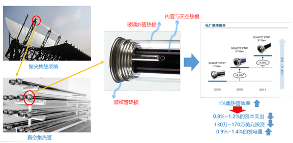 在夏至日,每天集热场每平方米热损为 3.2 kW•h/㎡,其中光学几何损失占比71.9%,管路损失7.1%,集热管热损占比21.0%。集热管热损作为集热终端部分的损失,代价非常昂贵,热损的大小可使得集热效率浮动2%-4%。
