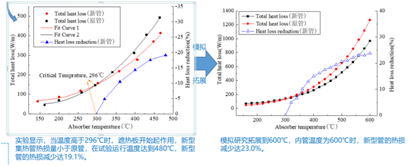 图:新型集热管(NER)随内管温度变化的总热损和外玻璃管温度图(模拟和实验)