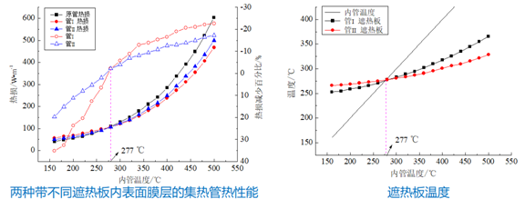 2,集热温度低于277℃时,两种新集热管会增大集热管辐射热损,但内表面发射率较高的集热管性能优于发射率较低的集热管;当高于277℃时,两种新集热管均能减少集热管辐射热损,但内表面发射率较低的集热管性能优于发射率较高的集热管。当集热温度在500℃时,两种新集热管分别会减少热损22.6%,17.3%。
