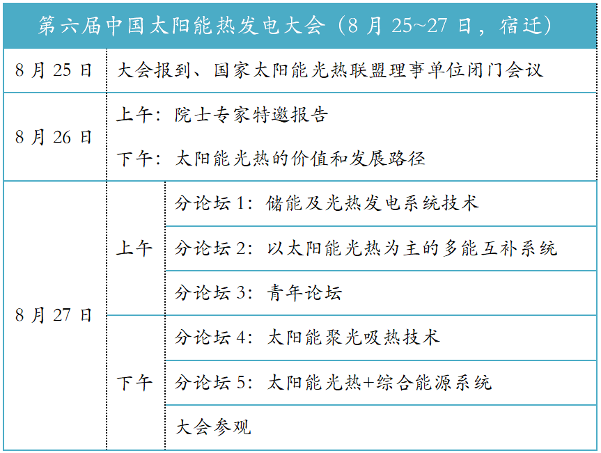 大会会期2天,共设置2场全体大会,5个分论坛,50+演讲,会后将安排参观宿迁光热发电工程技术研究中心(国家太阳能光热联盟003号公共技术服务平台)。