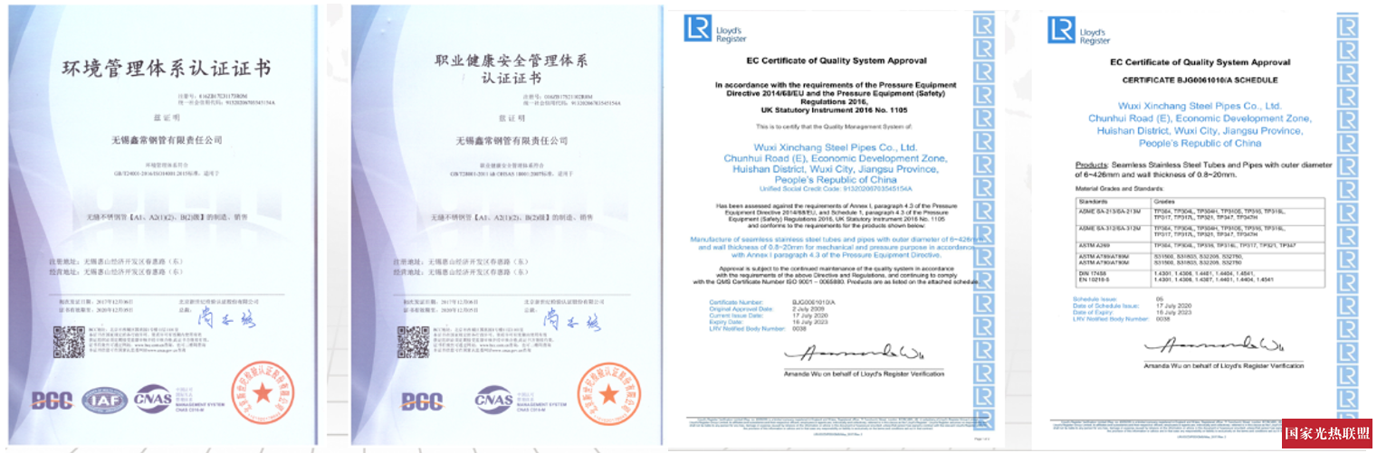 鑫常公司已通过英国劳式质量认证体系ISO9001:2015、欧盟承压设备指令PED97/23/EC、国家特种设备生产许可证(压力管道元件)证书、环境管理体系认证证书(ISO14001)、职业健康安全管理体系认证证书(OHSAS18001),为企业打入国际市场、进入压力容器行业和船舶制造业奠定了坚实的基础。
