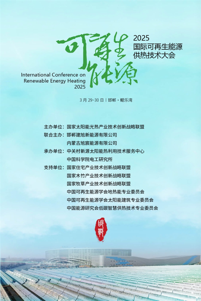 将于3月28~30日(28日周五报到)在河北省邯郸鲲乐湾组织召开“2025国际可再生能源供热技术大会”。大会由邯郸建旭新能源有限公司、内蒙古旭宸能源有限公司联合主办,中关村新源太阳能热利用技术服务中心、中国科学院电工研究所承办。大会主题为“绿色热能·驱动未来”。