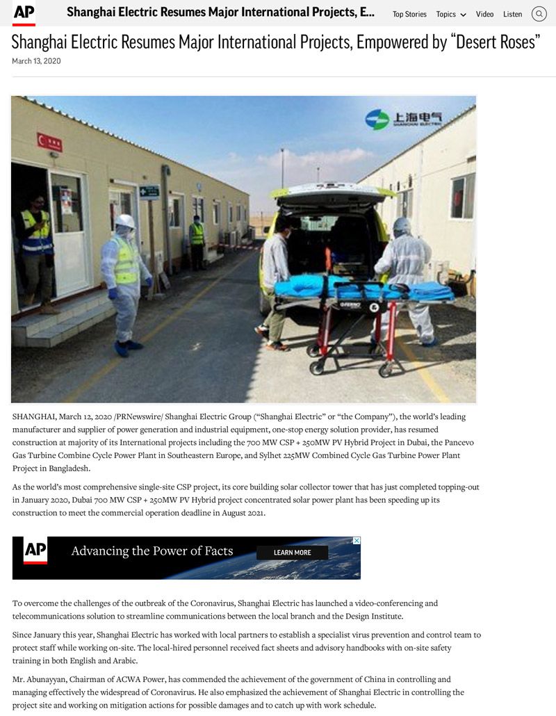 上周,一篇名为《“沙漠玫瑰”助上海电气大型海外项目复工》的境外媒体报道引发广泛关注,短时间引发美联社(AP)、俄塔社(TASS)、雅虎新闻(Yahoo News)、商业内幕(Business Insider)、德国《财经消息》等一批国外主流媒体的援引转发,将上海电气和中国企业面对新冠肺炎疫情的经验和做法介绍给全球企业。
