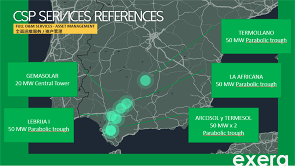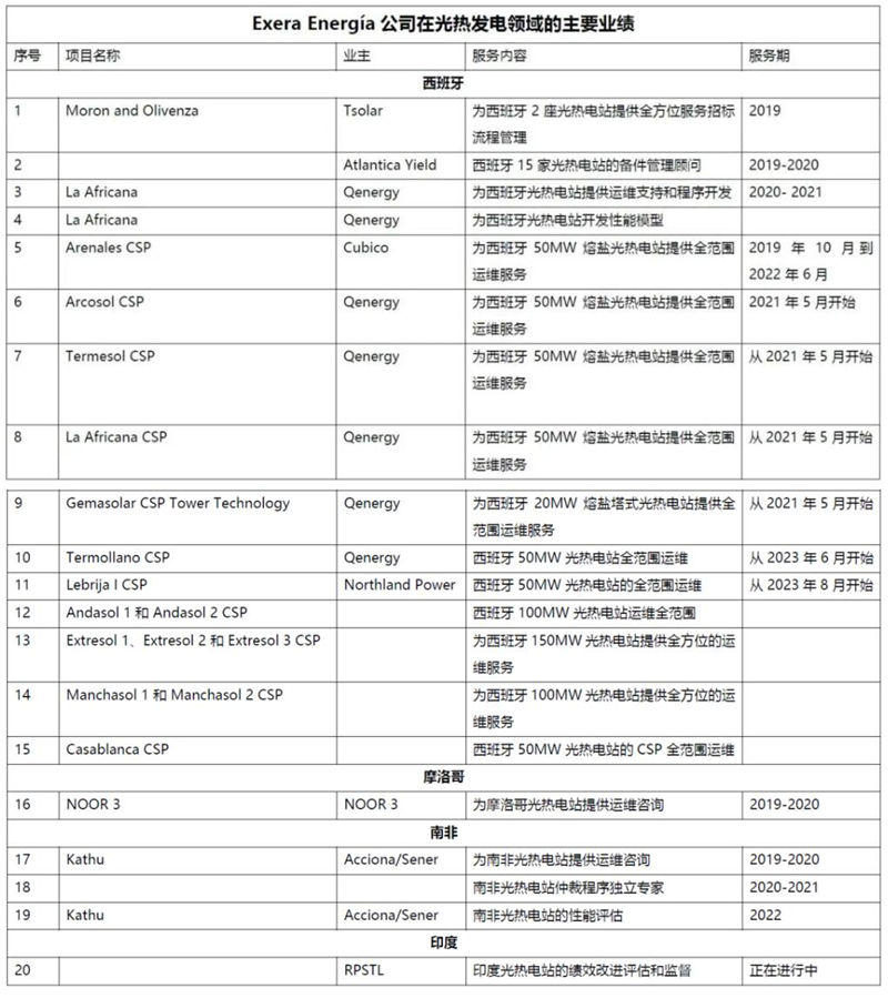 截至目前,Exera 公司在全球范围内有超过225个可再生能源发电项目业绩, 服务260家客户。其中,光热发电领域,拥有9个光热发电EPC工程服务业绩,提供了西班牙95%光热发电项目的咨询服务,为全世界第一家熔盐储热塔式光热电站20MW Gemasolar提供全范围运维服务,承担了全球范围内11个光热电站专业人员培训;已提供包括美国在内的59个光热电站的技术审查服务,为15个光热电站提供了全面的运维服务/运维支持服务相关工作。此外,在风能、光伏发电领域有超过35个电站的EPC/监理服务业绩,2个生物质项目EPC/监理项目。