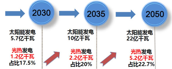 根据光资源、土地资源和水资源情况,我国光热发电装机容量在2030、2035和2050年的可以分别实现1.2亿千万、2.2亿千瓦、5.2亿千瓦。