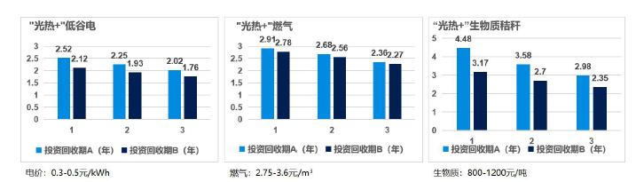 太阳能光热系统标准辐照17MJ/㎡条件下,日平均得热量约为2.25kWh/㎡。按采暖季节4个月计算,分别提前和延后半个月。采暖期太阳能光热系统利用率为100%,非采暖期太阳能光热利用率30%计算,对标白天电价0.3-0.5 元/kWh时,仅太阳能光热系统投资回收期为2-2.5年;对标冬季燃气价格2.75-3.6元/m³时太阳能光热系统投资回收期为2.4-2.9年;对标生物质颗粒价 800-1200元/吨时太阳能光热系统投资回收期为3.0-4.5年。