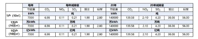 太阳能光热系统标准辐照17MJ/㎡条件下,日平均得热量约为2.25kWh/㎡。按采暖季节4个月计算,分别提前和延后半个月。采暖期太阳能光热系统利用率为100%,非采暖期太阳能光热利用率30%计算,单户配置10㎡太阳能光热系统,北方地区总安装量按1.65亿户计算,总安装量将达到16.5亿㎡,年度节能量将达到1.16万亿kWh,减少标煤4.6亿吨,减少二氧化碳排放11.5亿吨。按20年寿命周期计算,总节能量将达到23亿kWh,减少标煤92亿吨,减少二氧化碳排放230亿吨。具有显著的节能、减排的环境效益。