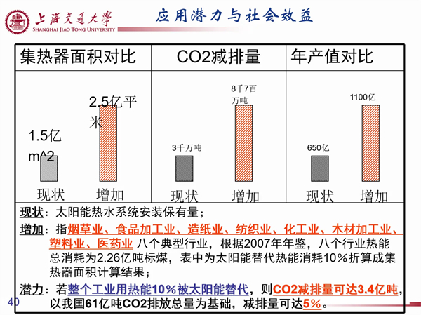 代彦军教授对太阳能在工业领域应用的前景进行了预测,他表示,如果整个工业用热能10%被太阳能替代,CO₂减排量可达3.4亿吨,占我国61亿吨CO₂排放总量的5%。这一预测基于对烟草业、食品业、造纸业等八个行业的分析,这些行业的热能总消耗为2.26亿吨标煤。