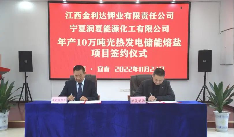 据江西金利达钾业有限责任公司(下文简称金利达钾业)消息,11月23日,该公司与宁夏润夏能源化工有限公司举行了年产10万吨光热发电储能熔盐项目签约仪式。