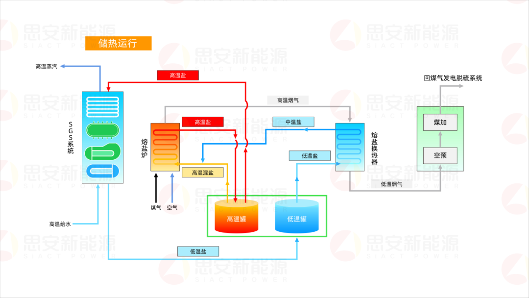 富裕的煤气如何进行有效的能量存储和利用是急需解决的问题。利用煤气进行熔盐加热和储能,在发电低谷时,煤气不发电,而直接加热熔盐储热;在用电高峰时,熔盐中的热量再通过换热产生高温蒸汽进行发电,起到调峰作用。