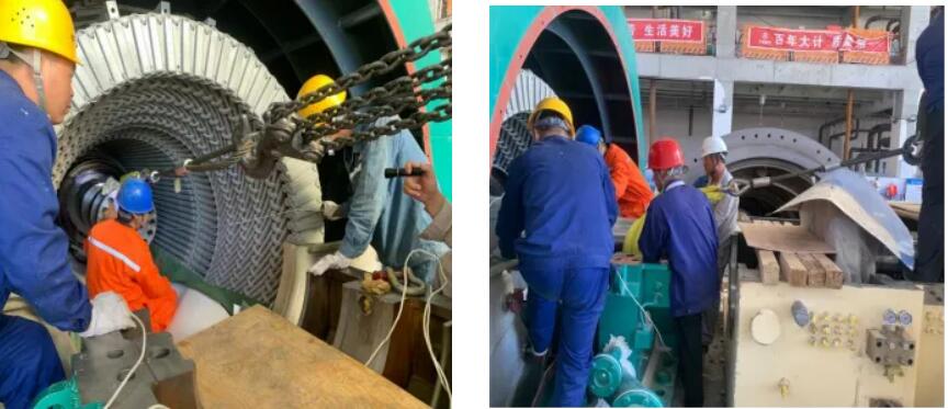 在所有作业人员的密切配合下,历时2小时,发电机转子成功穿装就位!