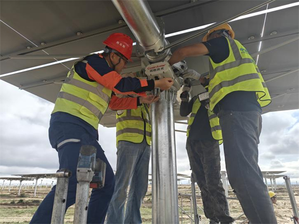 该项目镜场呈镜圆形布置,总采光面积约70.02万平方米,由23340台定日镜组成。为保证定日镜的生产供应,总承包项目部积极与分包单位沟通,通过优化库存管理策略,解决了原材料供应不及时的问题,保证了定日镜的生产。为保障定日镜安装质量,总承包部精心策划安装方案,自制定位工装并进行复测,提高定日镜方位角的准确性,采用力矩扳手对每台定日镜的安装力矩进行检测,确保安装质量;为保证吊装作业安全,项目管理人员每日对作业人员进行班前安全教育,并对安装作业全过程进行监督检查。进入冬季施工,项目部克服大风及严寒天气的影响,始终坚持“安全第一,质量为本”的原则,保证定日镜顺利安装完成。
