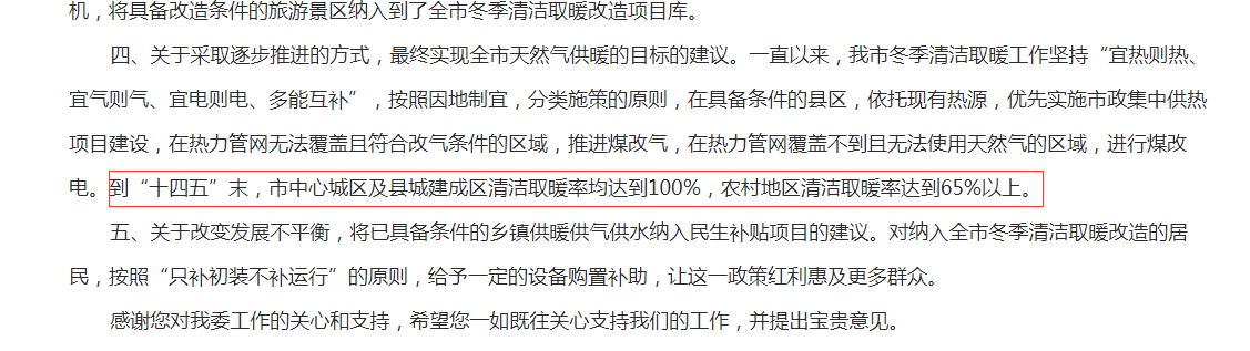此外,根据《对市四届人大八次会议第77号建议的复函》内容显示,到“十四五”末,榆林市中心城区及县城建成区清洁取暖率均达到100%,农村地区清洁取暖率达到65%以上。