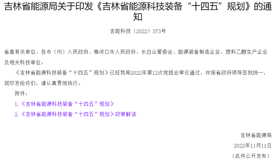 11月11日,吉林省能源局发布关于印发《吉林省能源科技装备“十四五”规划》的通知。