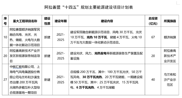 《阿拉善盟“十四五”能源发展规划》明确,有序发展可再生能源电源。开发太阳能中温集热制冷采暖成套系统、高温真空集热成套系统,开拓多元化太阳能光伏光热发电市场。因地制宜考虑将光伏系统与治沙、农业、林业、沉陷区治理相结合;适当开发光热电源。