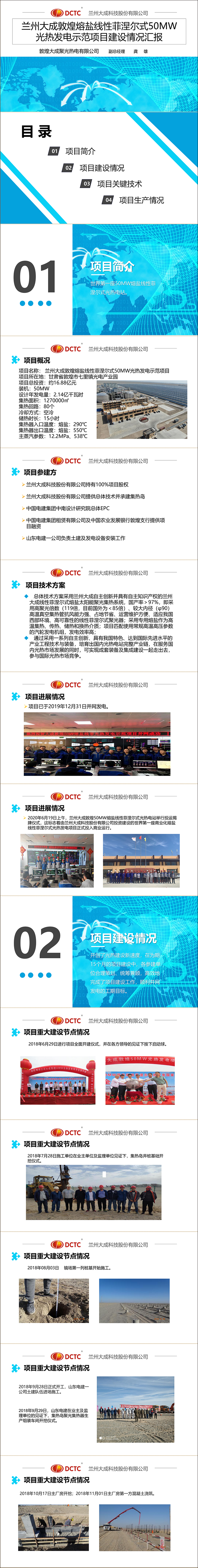 兰州大成敦煌熔盐线性菲涅尔式50MW光热发电示范项目是全球首座正式投入商运的商业化熔盐线性菲涅尔式光热电站,该项目采用兰州大成具有自主知识产权的线性菲涅尔聚光集热技术,并采用熔盐作为集热、传热和储热的统一介质,储热时长15小时,具备24小时持续发电能力。