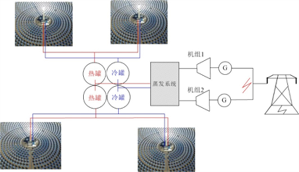 除了选好优质光热资源的场址之外,在光热发电规模化发展背景下,多塔两机的布局,可以提高光热资源利用率,提高机组运行稳定性,提高调峰灵活性,提高投资收益。目前,有些多塔光热电站方案,吸热塔和汽轮机组是一一对应的,如图,只是单塔单机的简单复制,在电力送出时再进行汇集和调度。