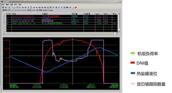 这幅截屏是7月5日的实时截屏,通过这个截屏,可以看到当天属于晴转多云的天气,下午云层比较多,DNI曲线变化比较大,犬牙交错。在这种复杂多变的天气情况下,不仅考验太阳岛的光热效率和硬件适应能力,还考验运行系统的智能化和适应能力,更考验运行人员的熟练程度。通过DNI曲线、运行曲线和熔盐曲线可以看出,在半天的多云导致DNI不但大幅、频繁波动,DNI值也很低的情况下,除了中午12点-1点的DNI极低,机组负荷人为的向下调整(50MW),其它时间段依然在最大安全负荷(62.76MW)稳定运行,且熔盐液位依然持续升高,18点49分熔盐罐满盐,达到最高液位。