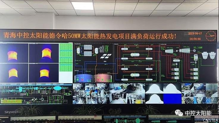 At 14:19, April 17th,2019, SUPCON SOLAR Delingha 50MW CSP Solar Tower Plant reached full-load operation. Records show the major indicators of the system has exceeded their design parameters: The molten salt at the outlet of the receiver reached 566℃ and main steam pressure reached 13.3MPa. The maximum turbine generator output power reached 50.65MW. The main subsystems including heliostats field, MSR, storage tanks, SGS and turbine-generator unit run steadily.