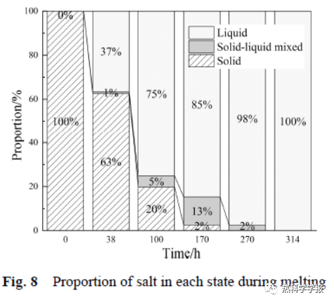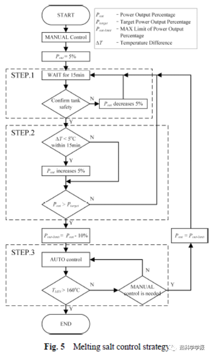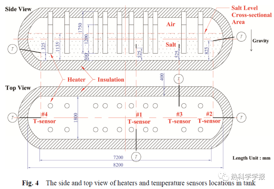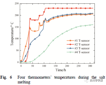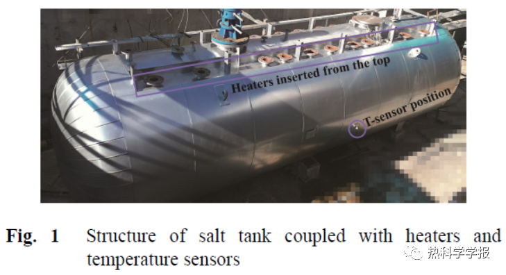 3industrial level tank. Twenty electrical heaters inside the tank are used to heat the salt with a total maximum input power of 240 kW. In order to ensure a safe and fast melting process, the whole process adopted an operating strategy of combining automatic control with manual control. The whole melting process lasted for 314 hours.