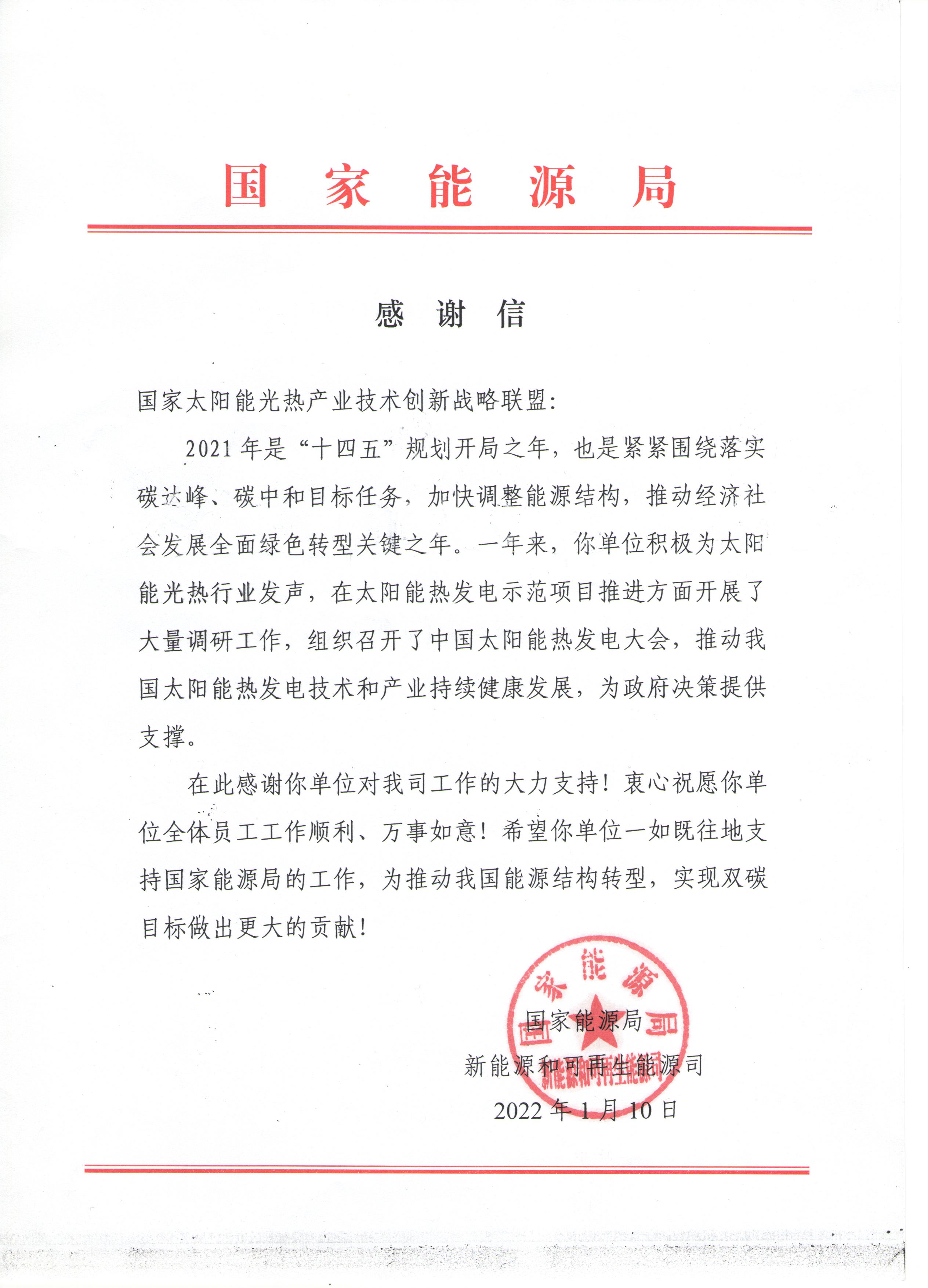 Recently, the China Solar Thermal Alliance(CSTA) received a letter of thanks from the New Energy and Renewable Energy Department of the National Energy Administration(NEA). This is another affirmation of the work of the CSTA in 2021 by the New Energy and Renewable Energy Department of the NEA following the 2020 thanks letter.