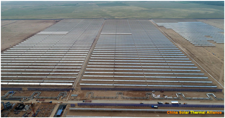 Royal Tech CSP Company is the solar field technology integrator. The plant situated in Urat, Inner Mongolia, northern China, with a capacity of 100MW. It covers an area of 7500mu (1mu equals about to 667sq meters), with 375 loops of EuroTrough collectors and 10h thermal storage system. China Shipbuilding New Power Co., Ltd (shorted as CSNP) as the EPC contractor is building this largest Parabolic Trough Power Plant in China.