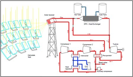 The project presents a novel power block concept for flexible electricity dispatch in a Concentrating Solar Power (CSP) plant. The power block is based on intercooled-unfired regenerative closed air Brayton cycle that is connected to a pressurized solar air receiver. The Closed Brayton cycle uses a mass flow regulation system centered on the pressure regulation (auxiliary compressor and bleed valve) in order to control the Turbine Inlet Temperature (TIT). Doing so, the system is able to modulate turbine electricity production according to variations in the solar resource and changes in power electric demand.