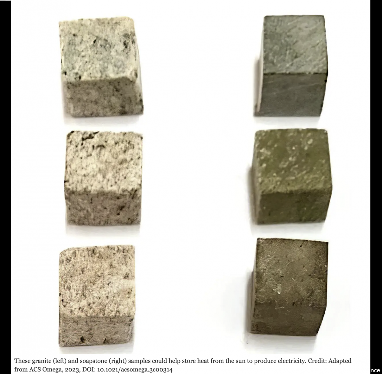 These granite (left) and soapstone (right) samples could help store heat from the sun to produce electricity. Credit: Adapted from ACS Omega, 2023, DOI: 10.1021/acsomega.3c00314