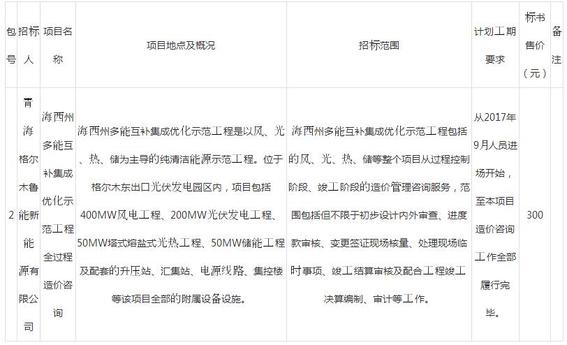 近日,鲁能海西州多能互补集成优化示范工程发布其全过程造价咨询招标公告。据公告显示,此次招标文件的获取时间段为2017年9月1日至2017年9月7日(法定公休日、法定节假日除外),每日上午9:00时至11:30,下午13:30至17:00时(北京时间),投标文件递交的截止时间与唱标时间均为2017年9月20日10:00。