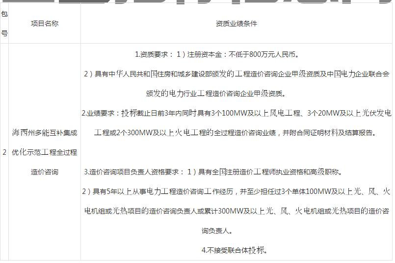 2、业绩要求:投标截止日前3年内同时具有3个100MW及以上风电工程、3个20MW及以上光伏发电工程或2个300MW及以上火电工程的全过程造价咨询业绩,并附合同证明材料及结算报告。