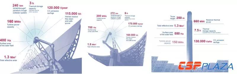 图:瓦尔扎扎特500MW太阳能发电园区项目包含了NoorI(左),NoorII(中)和NoorIII(右)(图片来源:SENER)