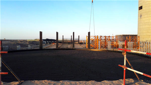虽然中国的西部目前是“冰霜覆地禾垂头,泥土僵硬水不流”,却挡不住建设者对光热事业的执着与热忱。2018年1月26日,北京首航艾启威节能技术股份有限公司(下文简称首航节能)敦煌100MW熔盐塔式光热发电示范项目建设现场传来项目最新进展:吸热塔吊车安装200米,塔内钢结构安装到60米;主厂房、辅助车间结构封顶;镜场立柱安装1100个;冷罐基础陶粒回填完成。