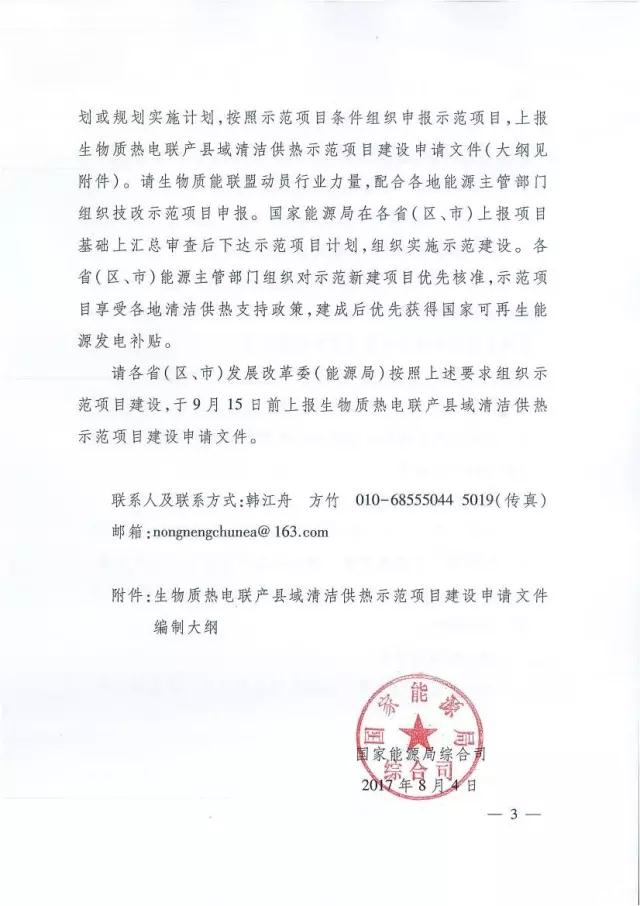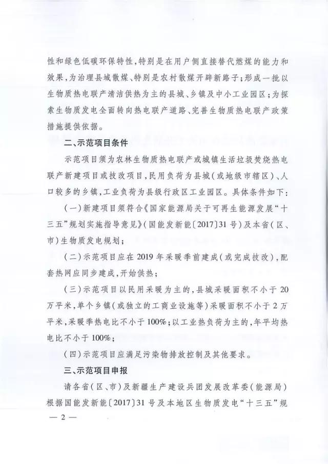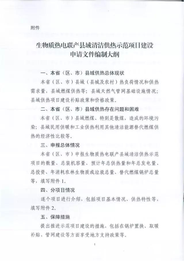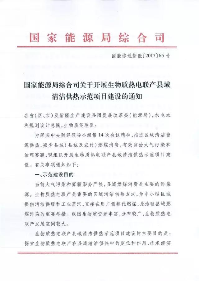 为落实中央财经领导小组第14次会议精神,推进区域清洁能源供热,减少县域(县城及农村)燃煤消费,有效防治大气污染和治理雾霾,近日国家能源局正式发布《国家能源局综合司关于开展生物质热电联产县域清洁供热示范项目建设的通知》(国能综通新能﹝2017﹞65号),要求各省(区、市)发展改革委(能源局)于9月15日前组织申报本省生物质热电联产县域清洁供热示范项目,并对示范新建项目优先核准,保障示范项目享受各地清洁供热支持政策,建成后优先获得国家可再生能源发电补贴。