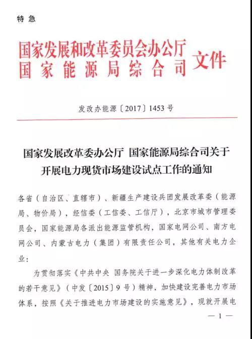 国家发展改革委力公厅、国家能源局综合司于8月28日联合下发了《关于开展电力现货市场建设试点工作的通知》特急文件,通知中称,2018年底前启动电力现货市场试运行,积极推动与电力现货市场相适应的电力中长期交易。