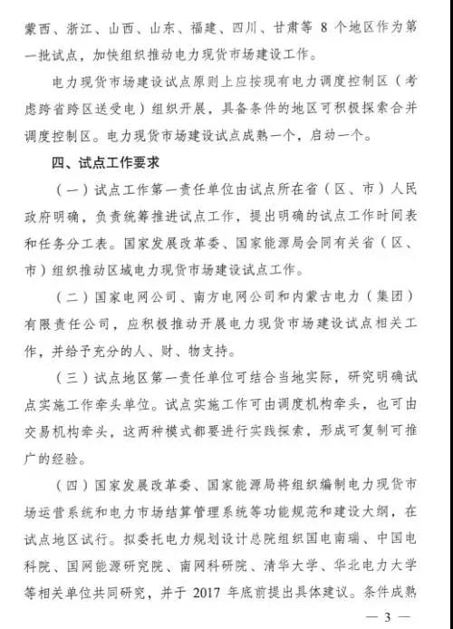 结合各地电力供需形势、网源结构和市场化程度等条件,选择南方(以广东起步)、蒙西、浙江、山西、山东、福建、四川、甘肃等8个地区作为第一批试点,加快组织推动电力现货市场建设工作。