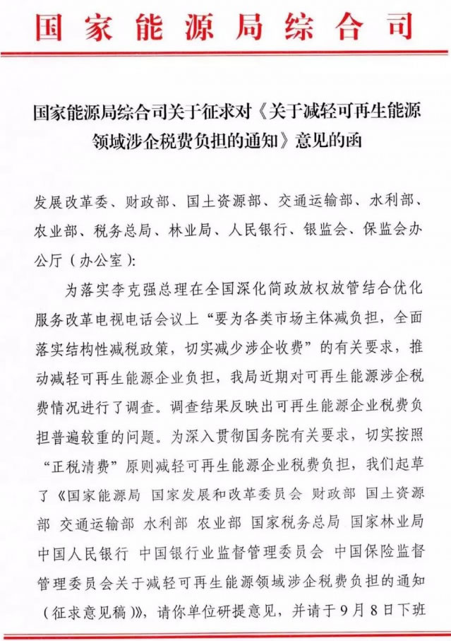 近日,国家能源局综合司下发了关于征求对《关于减轻可再生能源领域涉企税费负担的通知》(以下简称《通知》)意见的函。为切实减轻可再生能源企业增值税税负,《通知》强调,对纳税人销售自产的利用太阳能生产的电力产品,实行增值税即征即退50%的政策,从2018年12月31日延长到2020年12月31日。