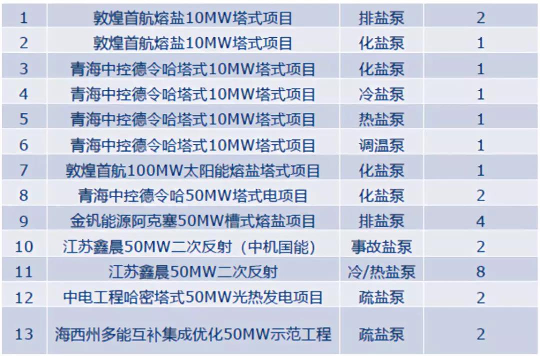 但事实上,目前各示范项目的推进进度有快有慢,对各个示范项目的熔盐泵采购都需要根据其项目推进进度来单独预估,方能准确把握市场。另外,不同的工艺类型,不同储热时长的项目,其对熔盐泵的需求也各不相同。具体体现在由于温度不同导致的材料选择不同,由于所需扬程不同导致的泵级数不同,由于储罐高度不同导致的泵长度不同等。熔盐泵应根据客户项目现场的运行方式,安装要求及实际工况特殊定制,而这些因素也将影响到熔盐泵的供货周期。
