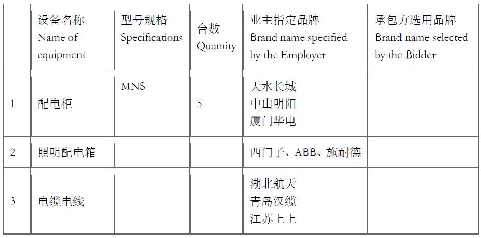 本合同项下供货范围包括但不限于以下,以下设备清单和规格是基于施工图设计所列,承包方负责根据国内相关规范完善本供货清单。设备品牌见以下供货清单,如未指明品牌,请承包方根据第三章技术规范补齐,业主有权排除明显不在同一档次上的品牌。除非业主同意,否则承包方选择的品牌不能超出该选择范围。