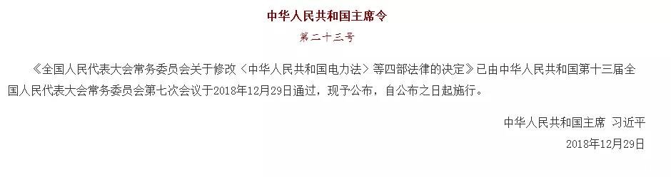 2018年12月29日,全国人民代表大会常务委员会关于修改《中华人民共和国电力法》等四部法律的决定,对《中华人民共和国电力法》作出修改,其中:第五条提出:国家鼓励和支持利用可再生能源和清洁能源发电。