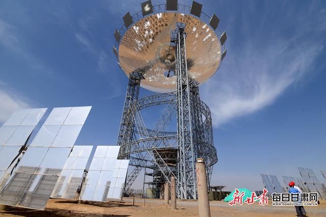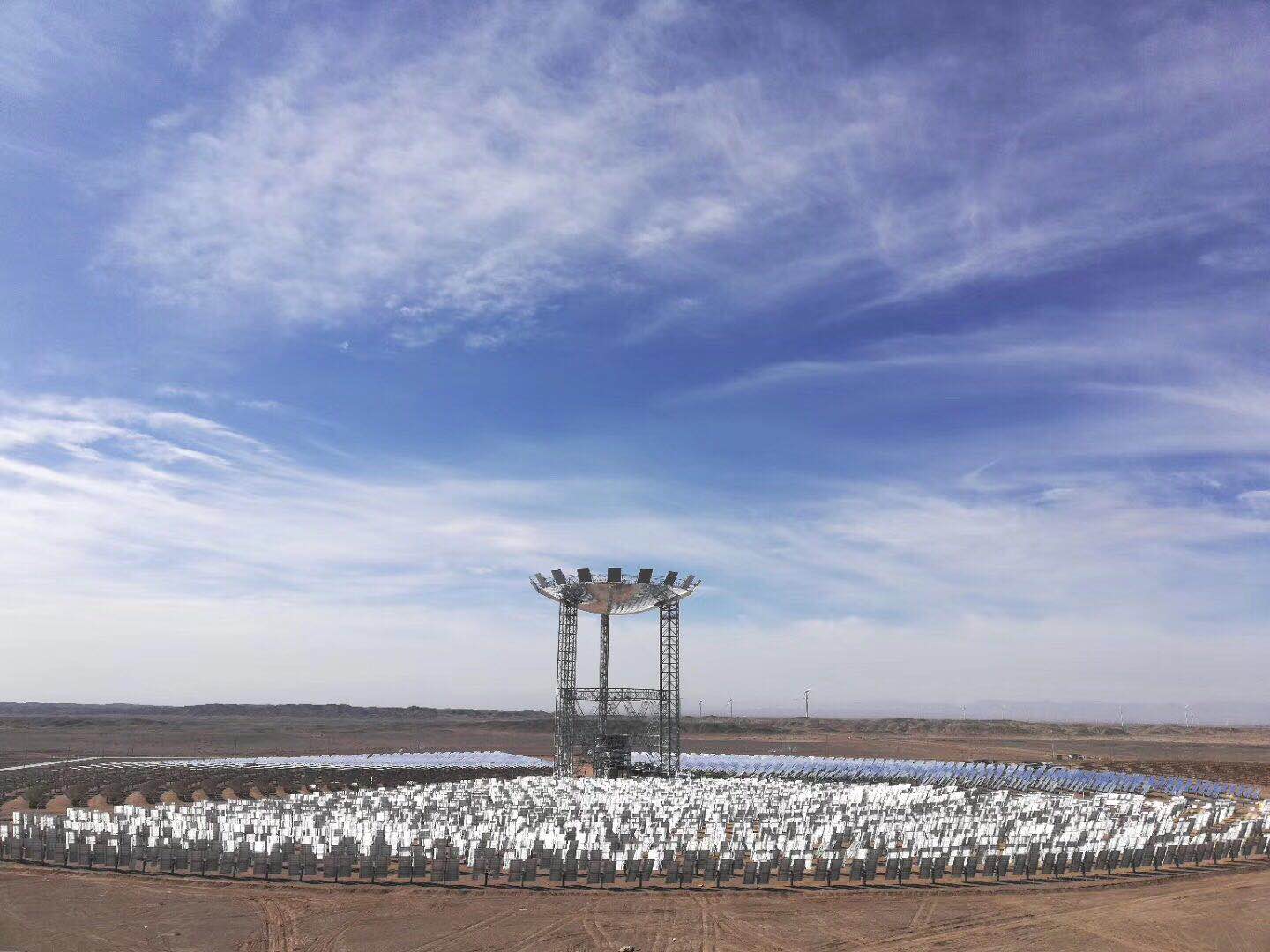 7月12日,“庆祝新中国成立70周年——网络名人走进甘肃”考察团走进位于玉门市郑家沙窝的玉门鑫能50MW光热发电项目建设现场,几千面定日镜围绕在二次反射塔周围,在烈日的照射下熠熠生辉。玉门鑫能光热公司总经理李端祥说:玉门鑫能熔盐塔式二次反射光热项目发电总装机容量为5万千瓦,储热时长9小时,设计年利用小时数超过4200小时。项目共建设15个镜场模块。该项目是2017年6月8日正式开工建设的,目前,1号模块已建成,并完成调试;2号模块二次塔正在顶升,定日镜安装即将完成。3-10号模块正在进行基础土建和钢结构、定日镜安装;主厂房主体已完工,汽轮机、发电机等主设备正在安装、调试。
