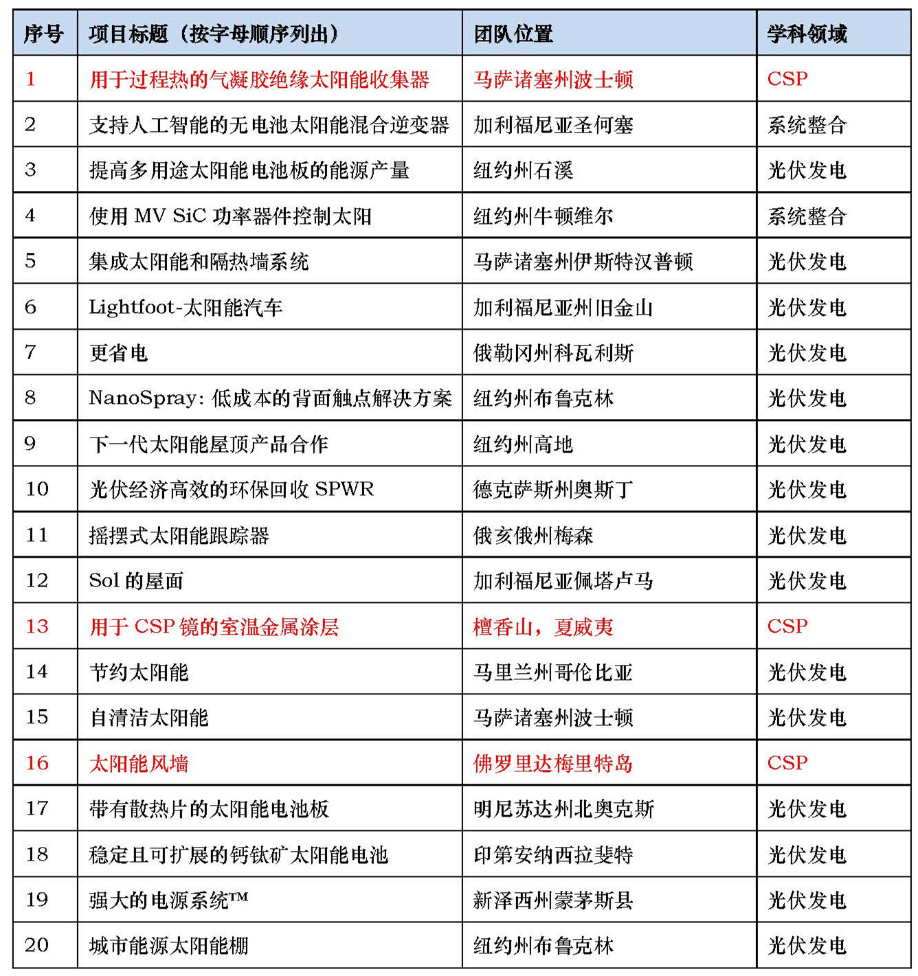附:美国制造太阳能奖第四轮半决赛20个项目概况(其中太阳能热发电项目3个)