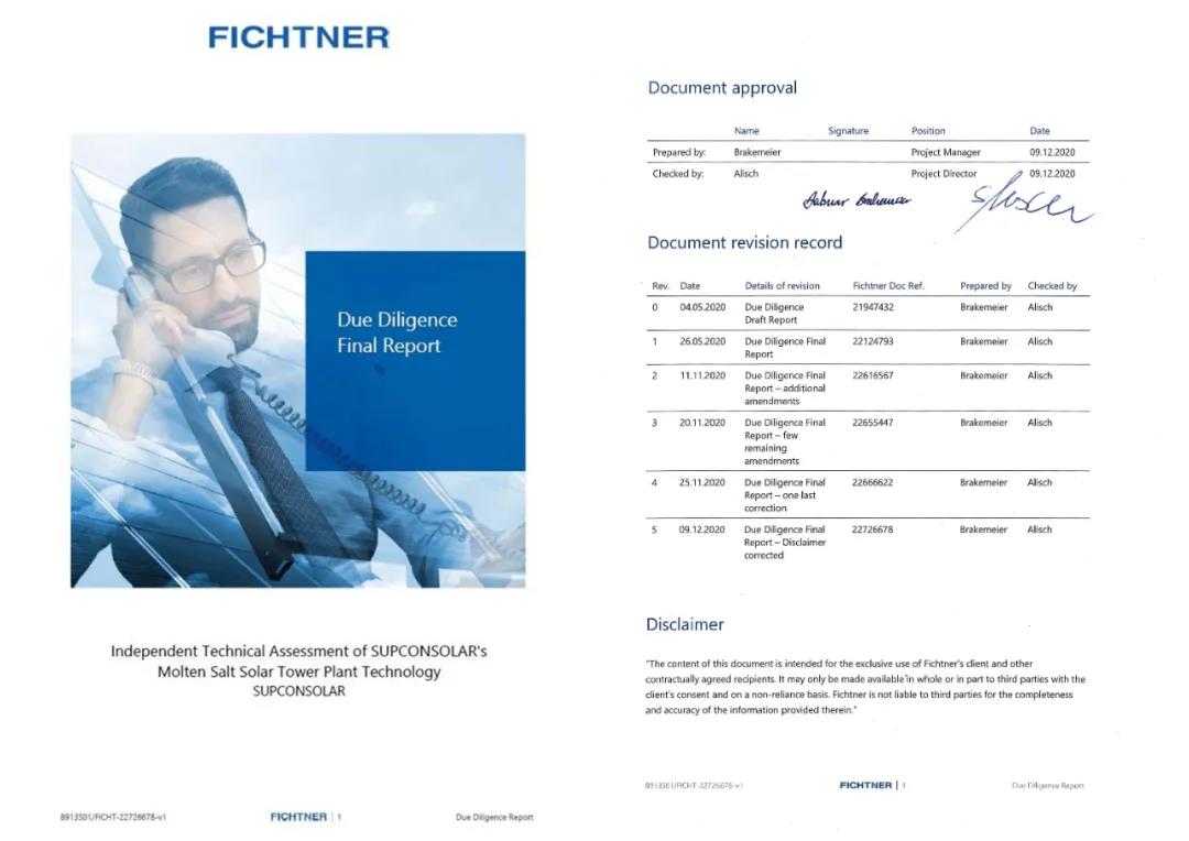 评估由Fichtner的技术专家独立开展,在历时数月的评估过程中,Fichtner的技术专家对电站整体设计水平及设备状态、主要设备设计工艺、电站运行情况及数据、关键系统的调试程序及运维策略等进行了详细的调研、审核与确认。评估报告显示,该电站的设计已达到全球同类技术的最先进(state-of-the-art)水平,主要设备运行状态良好,且具有多项设计亮点,包括定日镜及控制系统完全自主开发,性能质量优异;熔盐泵数量最小化设计,在降低成本及自身耗电量的同时仍能保持很高的可靠性与可用率;蒸汽循环系统双列设计,可提高运行的灵活性等方面。