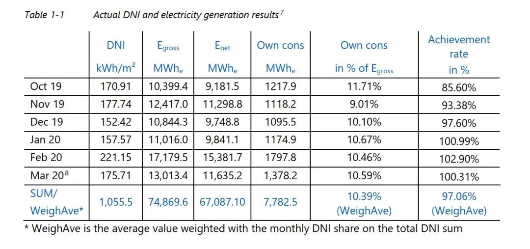 此外,Fichtner的技术专家通过对性能考核期内运行数据的审核及现场考察确认,认为该电站运行表现优良。Fichtner重点评估了电站在进入性能考核期后首个半年度(2019年10月至2020年3月)的性能表现。通过对逐月的DNI总量、理论发电量、实际发电量、上网电量、厂用电量等关键指标进行分析,Fichtner在评估报告中表示,电站在这六个月内的综合发电量达成率达到97.06%,而且呈现了逐月上升的趋势,这体现了电站运营策略的逐步优化过程,并认为未来仍有进一步提升的空间。
