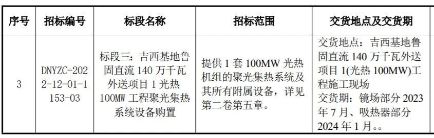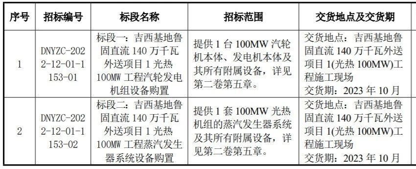 4月24日,国家电力投资集团有限公司发布吉电股份吉西基地鲁固直流 140 万千瓦外送项目100MW光热工程汽轮发电机组、蒸汽发生器、聚光集热系统中标候选人公示。