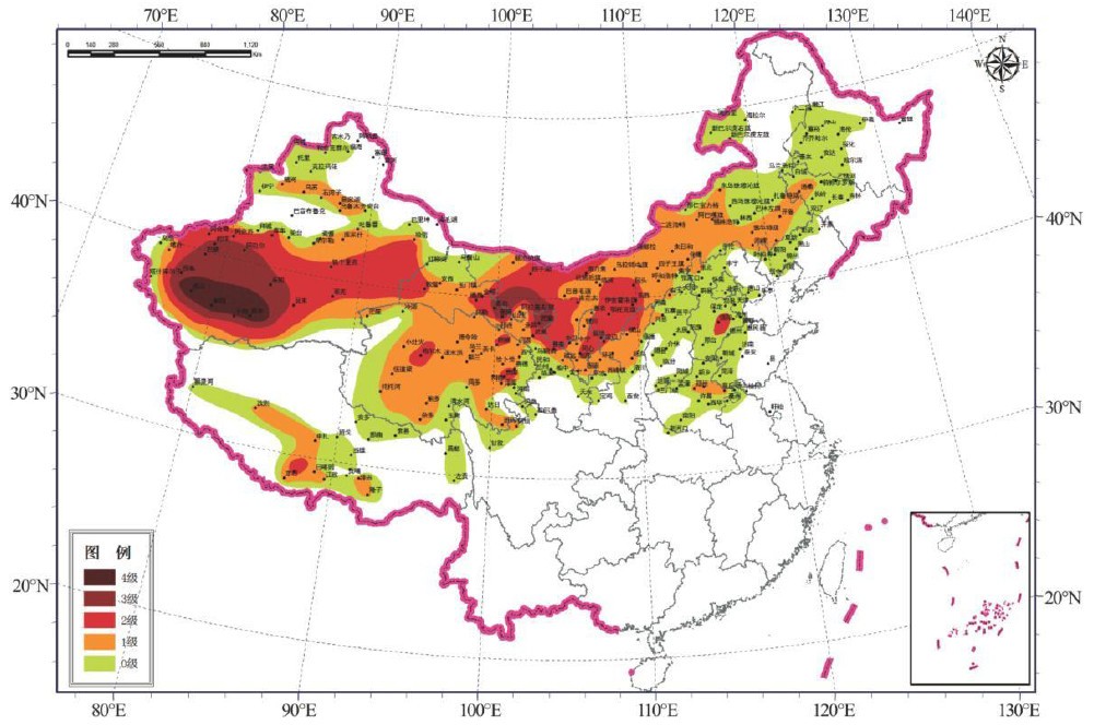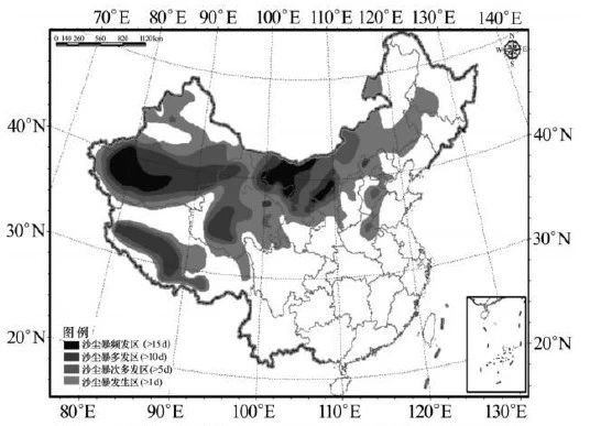图4:中国沙尘暴发生的气象危险度区划图