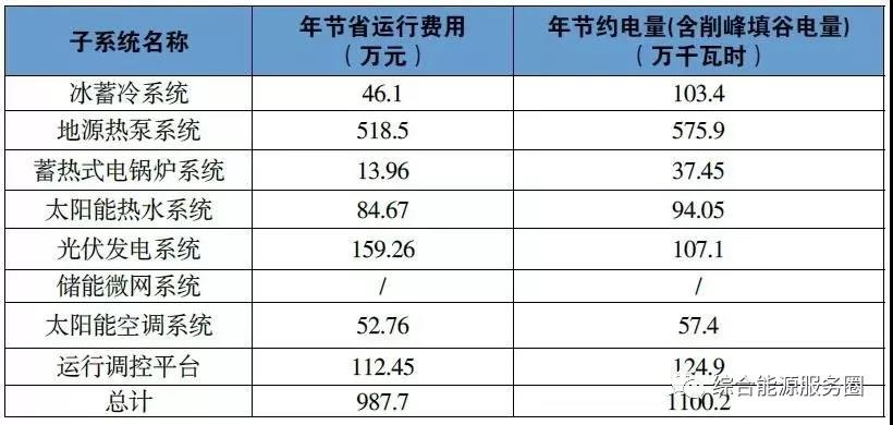 项目园区由光伏发电、储能微网、太阳能空调、太阳能热水、冰蓄冷空调、地源热泵、蓄热式电锅炉七个能源子系统及一个运行调控平台构成,为园区14万平米的建筑区域提供冷、热、电一体化供应,年效益总计达987.7万元。