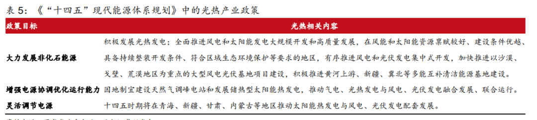 随着我国新能源发电装机规模快速增长,储能的重要性日益突出,而光热发电能够承担“基荷电源+调节电源+同步电源”多重角色,能够与光伏、风电起到较好的协同、互补作用,因而“风光热储”、“光热储能+”等一体化项目成为未来重要的发展趋势。2022年3月22日,国家发展改革委、国家能源局联合印发《“十四五”现代能源体系规划》表明,“十四五”将推动光热发电与风电光伏融合发展、联合运行,因地制宜发展储热型太阳能热发电。